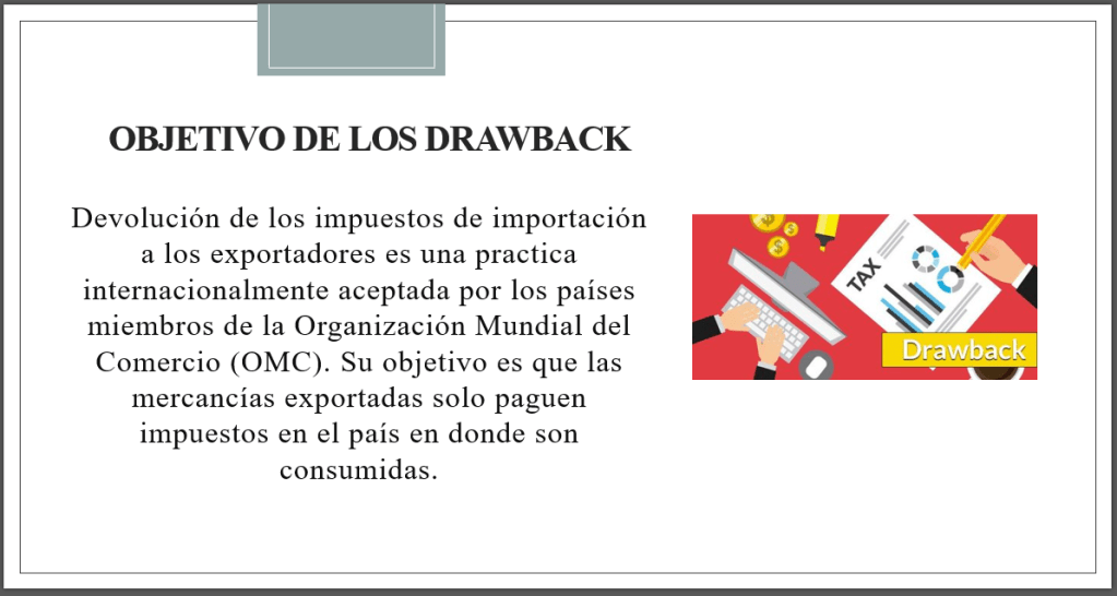Ejemplo: podemos mencionar una empresa que se encarga de la producción de prendas de vestir, los insumos que importe para producir esas prendas pueden tener una devolución de impuestos; solo deben solicitar la devolución del impuesto que pagó por la importación de esos insumos, una vez que sea exportados.