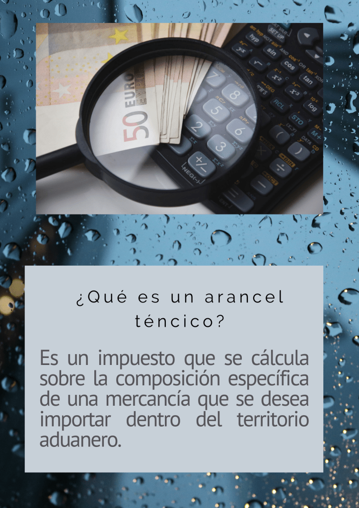 Arancel técnico: Este tipo de gravamen se aplica sobre las composiciones especificas contenidas en la mercancía que se desea importar, que por la naturaleza de los componentes se debe de emplear un cálculo sobre la base de dicho bien, por ejemplo $3USD por cada unidad + $2USD por cada kilogramo; donde sobre esta base se calcula la importación de un bien.
